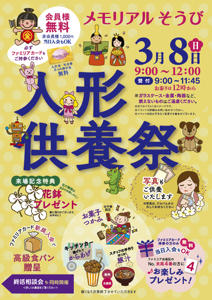 お知らせ 2026.02.28 2026年 3月8日(日曜)人形供養祭について ~イベントのお知らせ~ 2026年3月8日 (日曜) 人形供養祭を開催いたします。 会員様は供養料無料!当日の入会もOK(入会も無料) 来場記念として花鉢をプレゼント! からあげと豚汁のふるまいもございます。※どちらも数に限りがあります。 詳しくは画像をご確認ください。 葬儀相談やご見学、終活相談(相続・遺言など)も受け付けています! 皆様、お待ちしております♪